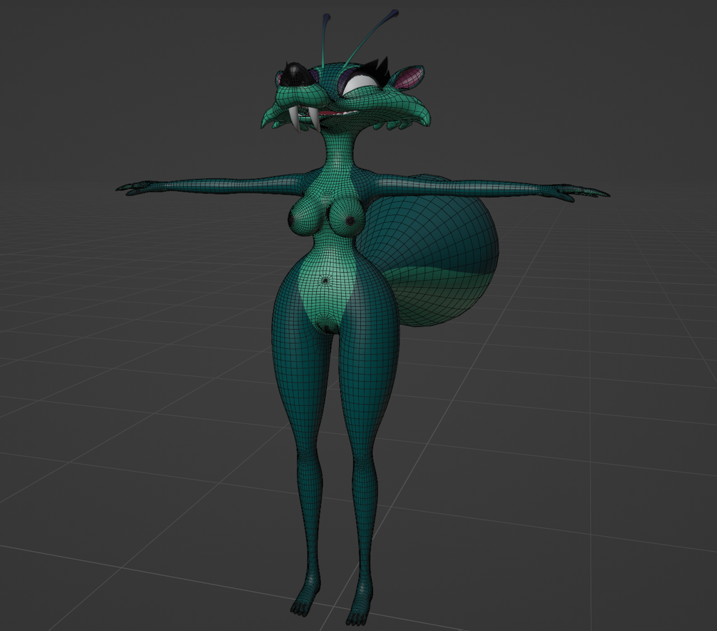 Note: Her bodysuit is set to "maximum chest size" by default, but you can tone it down via shapekey in the rig panel.